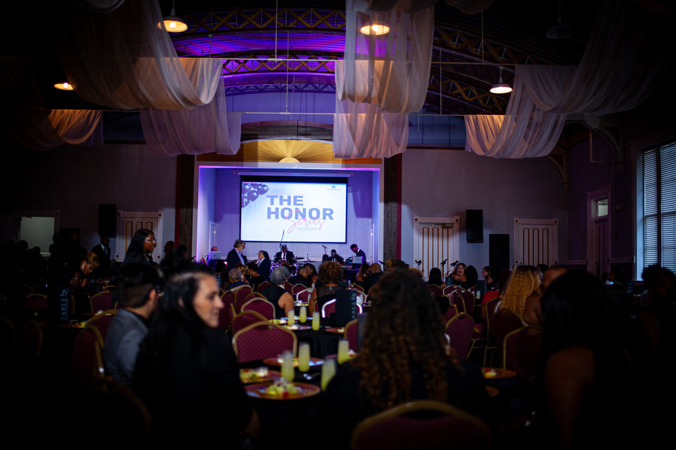 A series of images capturing people attending an indoor event, seated at tables, clapping, and listening to a speaker on stage.