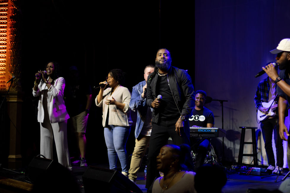 A series of images capturing individuals speaking passionately on stage, against brick wall backgrounds, and energetically performing with microphones.
